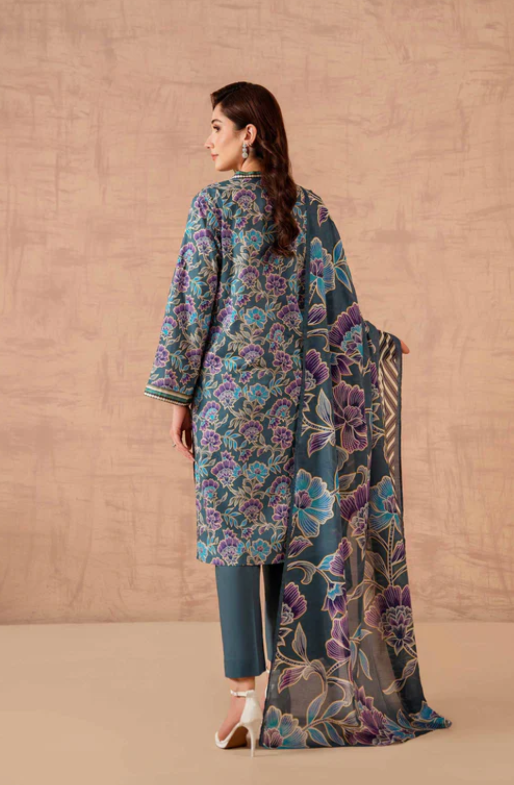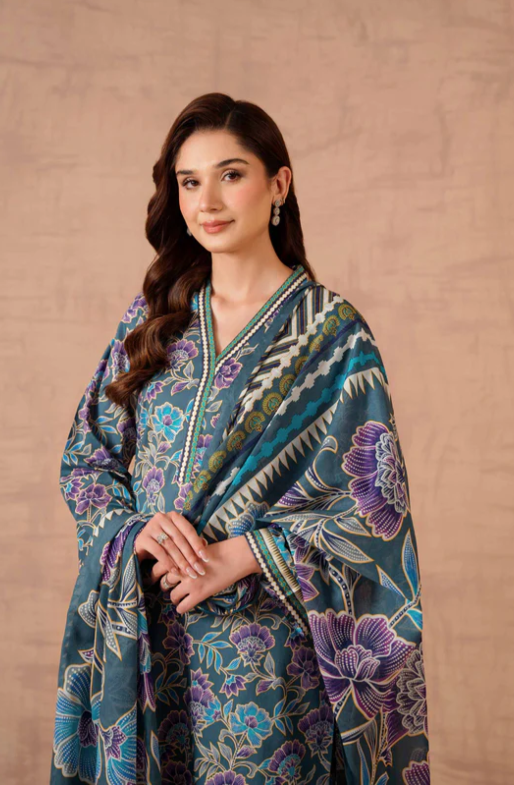 Envelope yourself beautifully with this printed three-piece from the latest unstitched summer collection.